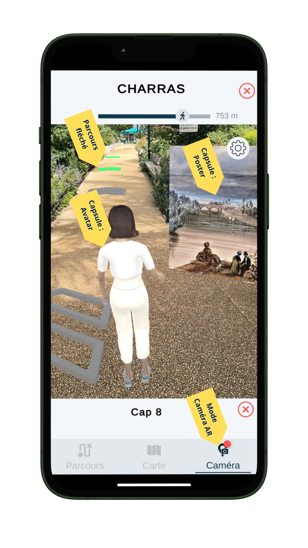 Pour voir et écouter tout cela, passez en mode caméra en bas à droite de l’écran. Tenez votre appareil comme pour prendre une photo. Vous verrez les flèches qui vous guideront vers l’histoire invisible.