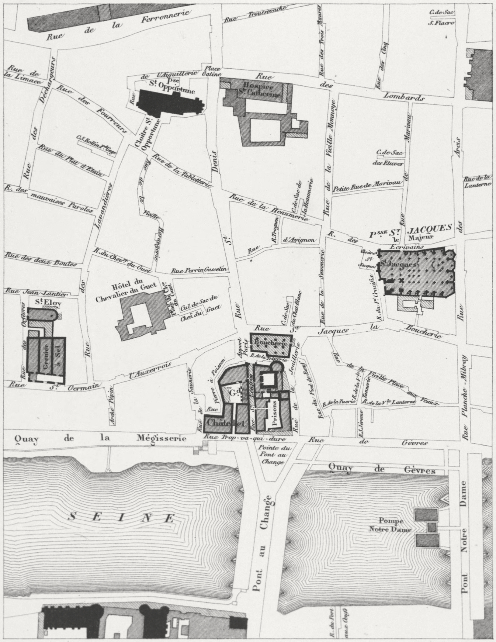 « Le Grand-Châtelet fut, après le gibet de Montfaucon, l’édifice le plus sinistre de Paris, tant par sa physionomie et sa destination que par son voisinage qui faisait de ce quartier l’endroit le plus fétide de la capitale. »
