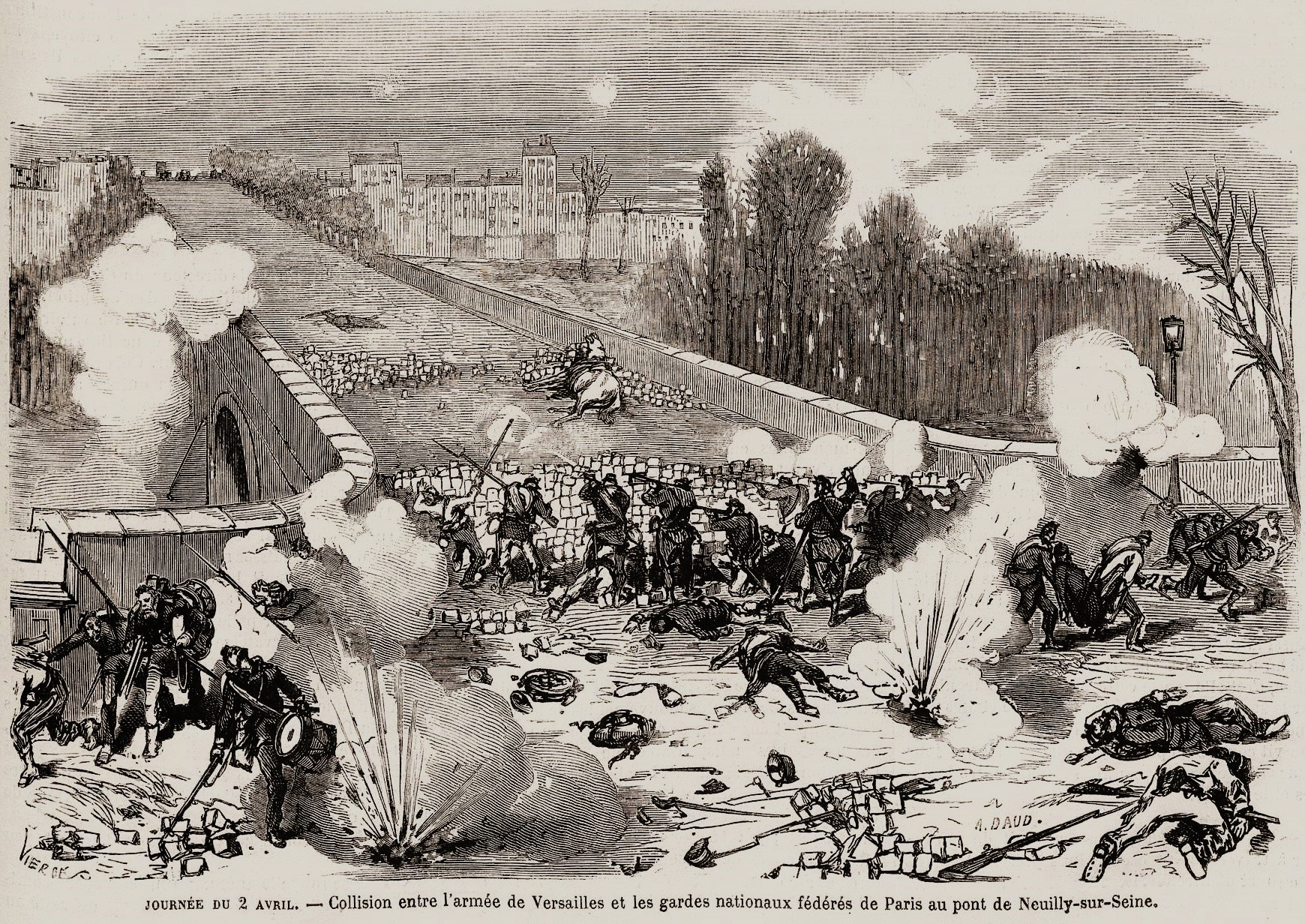 Sur l’image, vous voyez les insurgés, côté Neuilly, stopper momentanément l’avancée inexorable des troupes versaillaises à Courbevoie, qui iront réprimer la rébellion jusque dans le cimetière du père Lachaise à Paris.